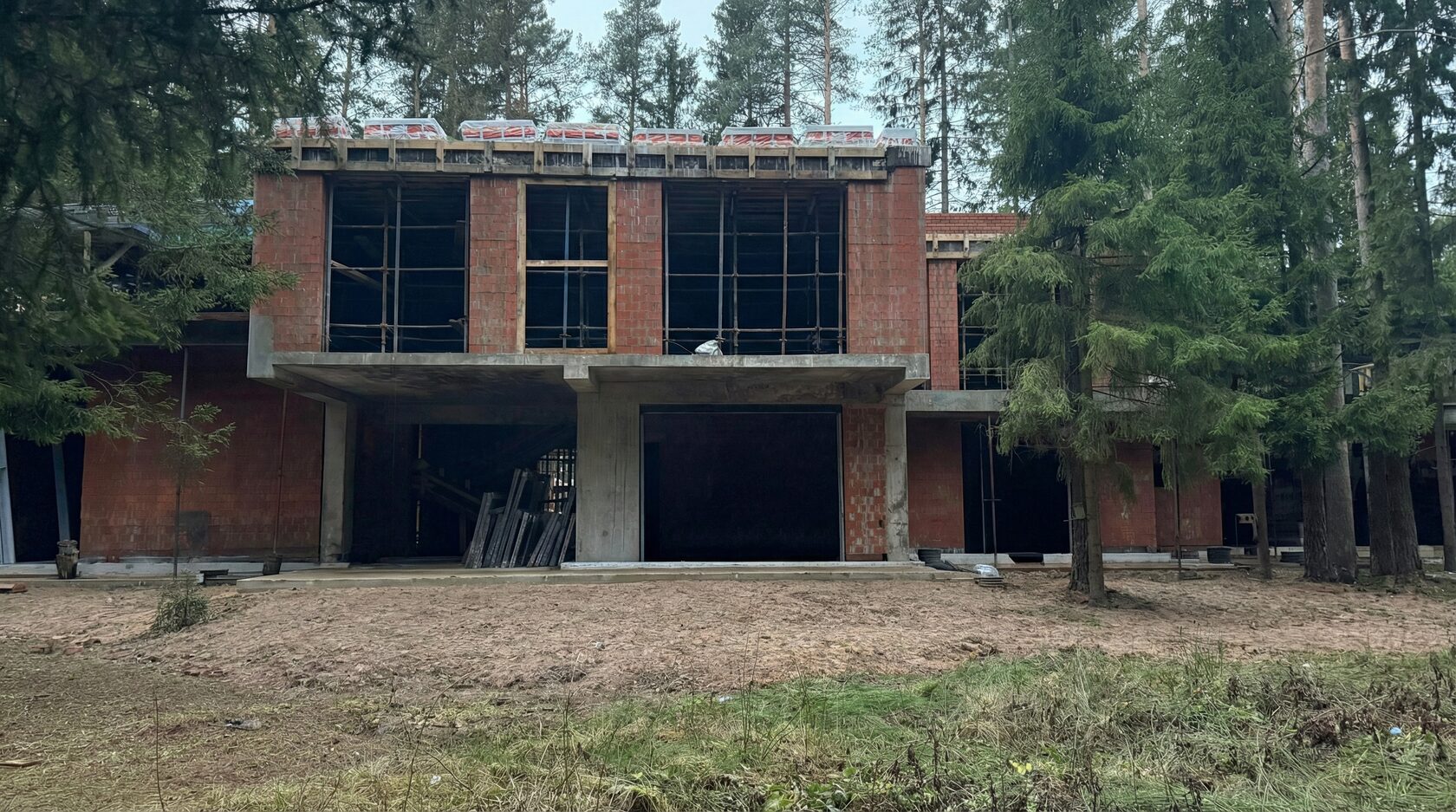 Современный двухэтажный загородный дом в стиле минимализм с тёмными фасадами из дерева гармонично вписан в сосновый лес, сохраняя приватность и максимум естественного света. Горизонтальная композиция с широкими выносами кровли, террасой и встроенным гаражом формирует комфортную планировку.